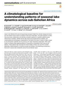 Amadori, M, Greife, AJ, Carrea, L, Pinardi, M, Caroni, R, Calamita, E, Serrao, L., Maidment, R., Bordoni, S, Giardino, C, Bresciani, M, Fava, FP, Schmid, M, Ndebele-Murisa, M, Nhiwatiwa, T, Crétaux, J-F, Merchant, CJ, Liu, X, Simis, SGH, Lomeo, D, Yesou, H, Albergel, C and Woolway, R! 2025 A climatological baseline for understanding patterns of seasonal lake dynamics across sub-Sahelian Africa. Communications Earth & Environment, 6 (1). 10.1038/s43247-025-02684-5