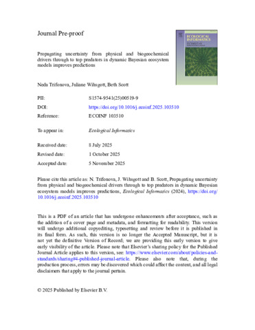 Trifonova, N, Wihsgott, JU and Scott, BE 2025 Propagating uncertainty from physical and biogeochemical drivers through to top predators in dynamic Bayesian ecosystem models improves predictions. Ecological Informatics. 103510. 10.1016/j.ecoinf.2025.103510 (In Press)