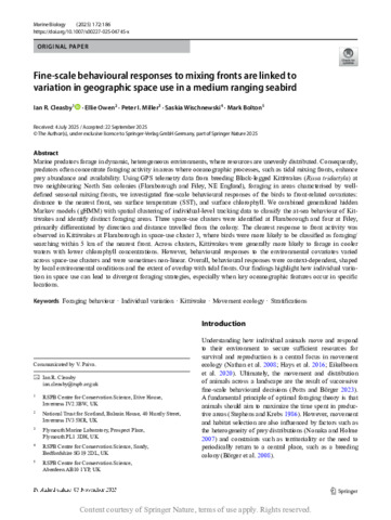 Cleasby, IR, Owen, E, Miller, PI, Wischnewski, S and Bolton, M 2025 Fine-scale behavioural responses to mixing fronts are linked to variation in geographic space use in a medium ranging seabird. Marine Biology, 172 (12). 10.1007/s00227-025-04745-x