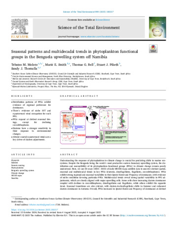 Moloto, TM, Smith, ME, Bell, TG, Piketh, SJ and Thomalla, SJ 2025 Seasonal patterns and multidecadal trends in phytoplankton functional groups in the Benguela upwelling system off Namibia. Science of The Total Environment, 999. 180217. 10.1016/j.scitotenv.2025.180217
