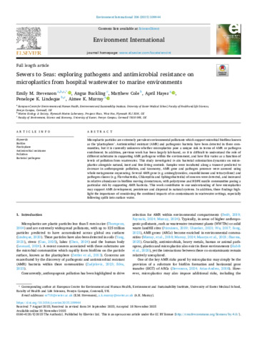 Stevenson, EM, Buckling, A, Cole, MJ, Hayes, A, Lindeque, PK and Murray, AK 2025 Sewers to Seas: exploring pathogens and antimicrobial resistance on microplastics from hospital wastewater to marine environments. Environment International, 206. 109944. 10.1016/j.envint.2025.109944