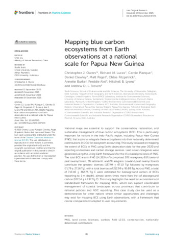 Owers, CJ, Lucas, RM, Planque, C, Clewley, D, Paget, M, Fitzpatrick, C, Burke, A, Alei, F, Lyons, MB and Steven, ADL 2025 Mapping blue carbon ecosystems from Earth observations at a national scale for Papua New Guinea. Frontiers in Marine Science, 12. 10.3389/fmars.2025.1697243