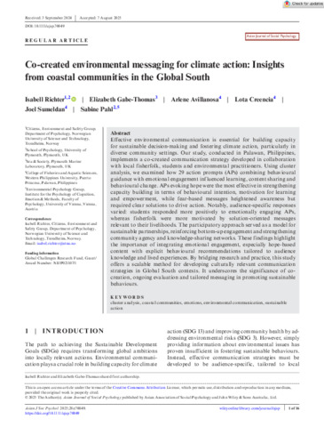 Richter, I, Gabe‐Thomas, E, Avillanosa, A, Creencia, Lota, Sumeldan, J and Pahl, S 2025 Co‐created environmental messaging for climate action: Insights from coastal communities in the Global South. Asian Journal of Social Psychology, 28 (4). 10.1111/ajsp.70049