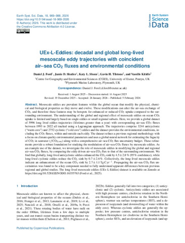 Ford, DJ, Shutler, JD, Sheen, KL, Tilstone, GH and Kitidis, V 2026 UEx-L-Eddies: decadal and global long-lived mesoscale eddy trajectories with coincident air–sea CO 2 fluxes and environmental conditions. Earth System Science Data, 18 (2). 969-988. 10.5194/essd-18-969-2026